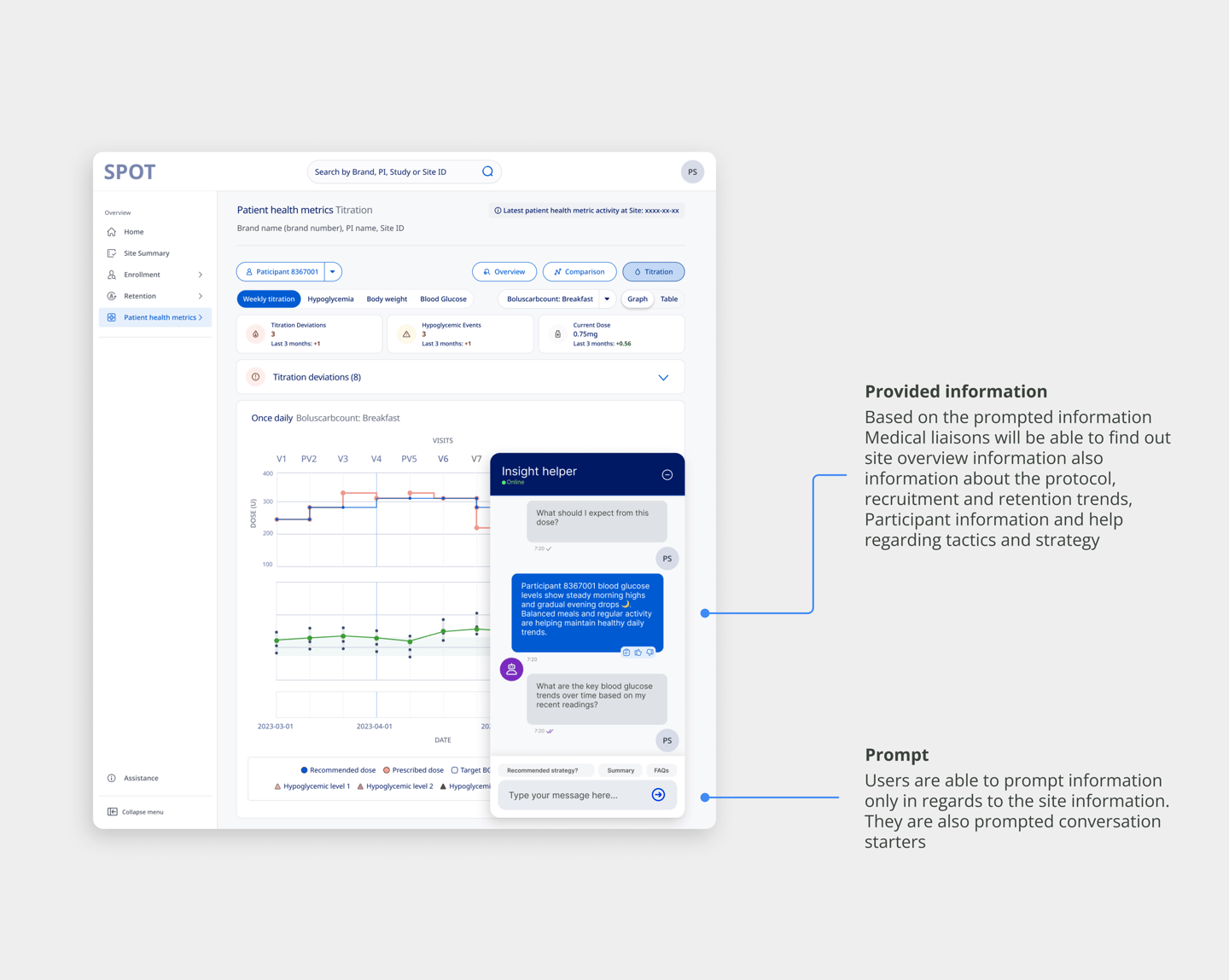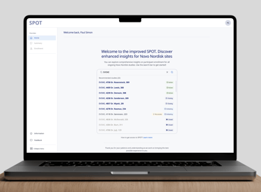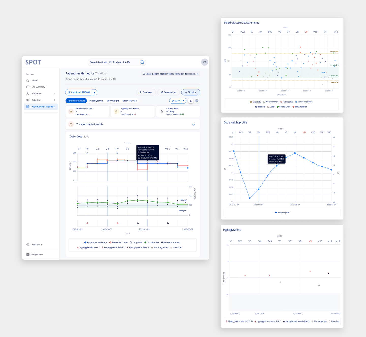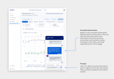 Developed for Medical Liaisons and Clinical Medical Managers, SPOT is a comprehensive tool that aids in assessing study performance at clinical sites. The platform provides essential insights into enrollment, retention, and patient information, while also enhancing collaboration through dose surveillance and titration data.