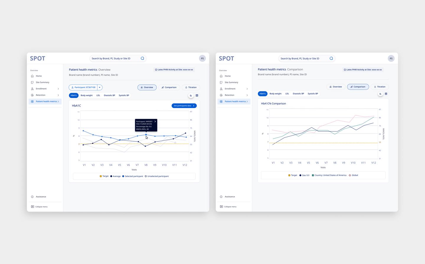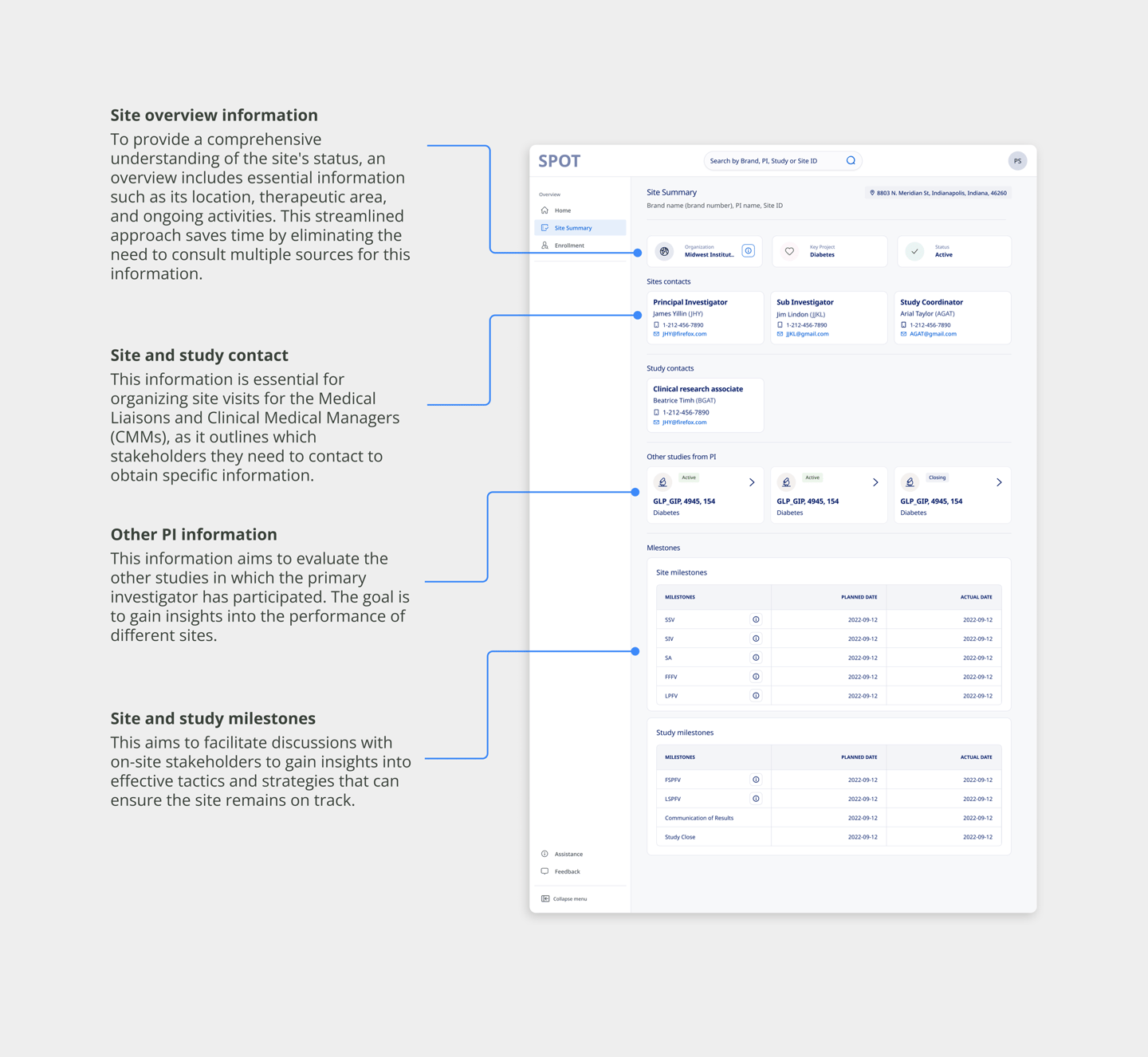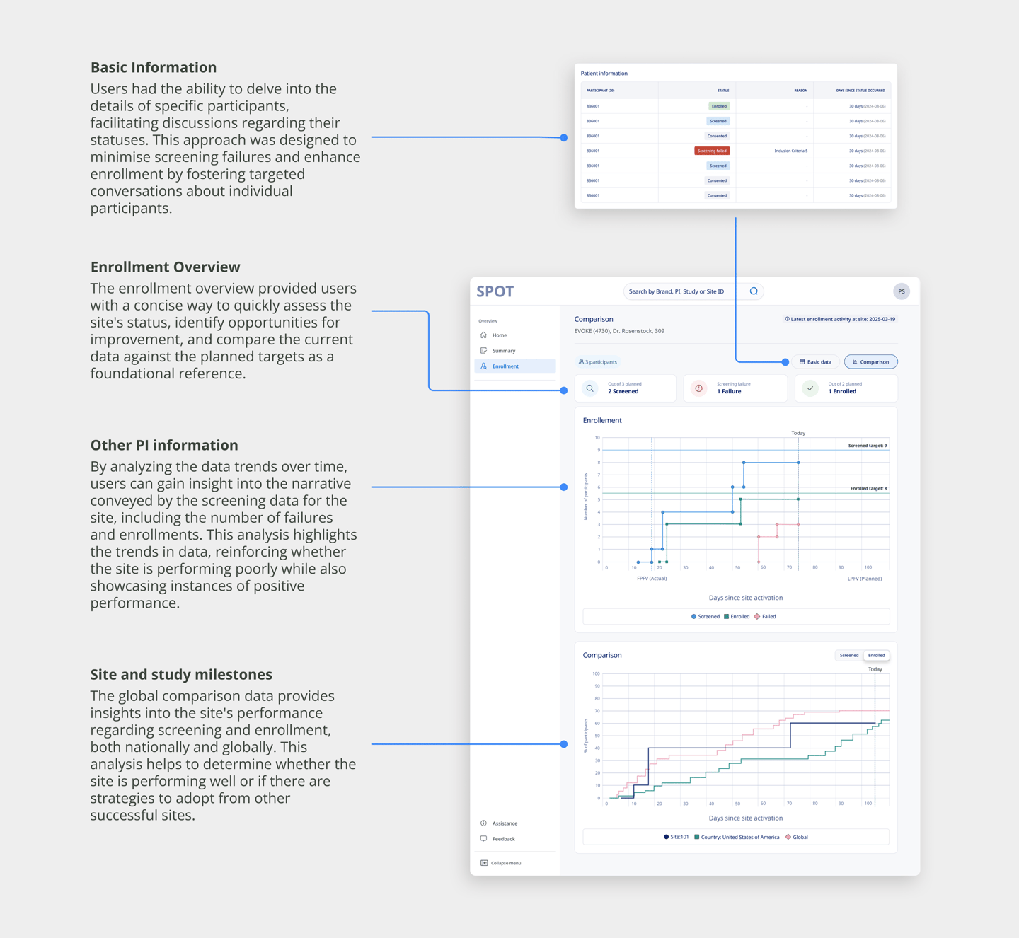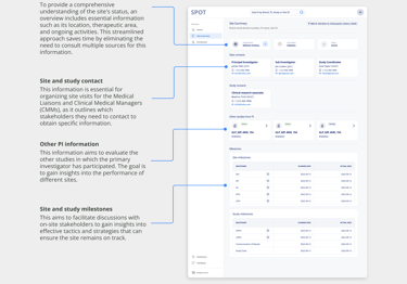 SPOT empowers Medical Liaisons (MLs) with essential tools to assess site performance and plan targeted support by tracking enrollment trends and comparing site metrics against national benchmarks, fostering meaningful discussions with investigators. It provides on-demand insights into participant health metrics, enabling MLs to identify outliers and understand needs, while streamlining data gathering and delivering actionable insights on screening failures. Ultimately, SPOT enhances care coordination by organizing key health information for more effective interactions with healthcare providers.