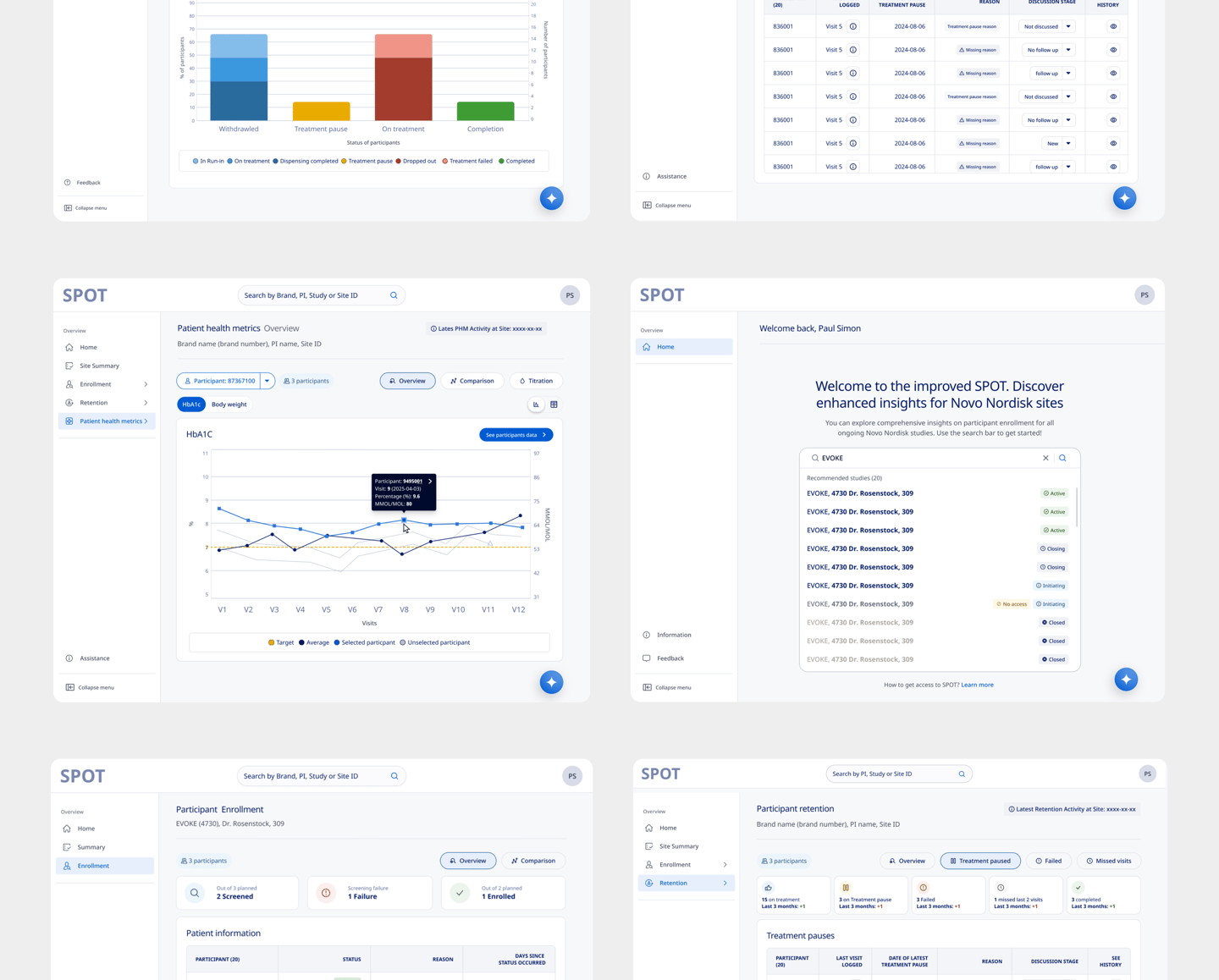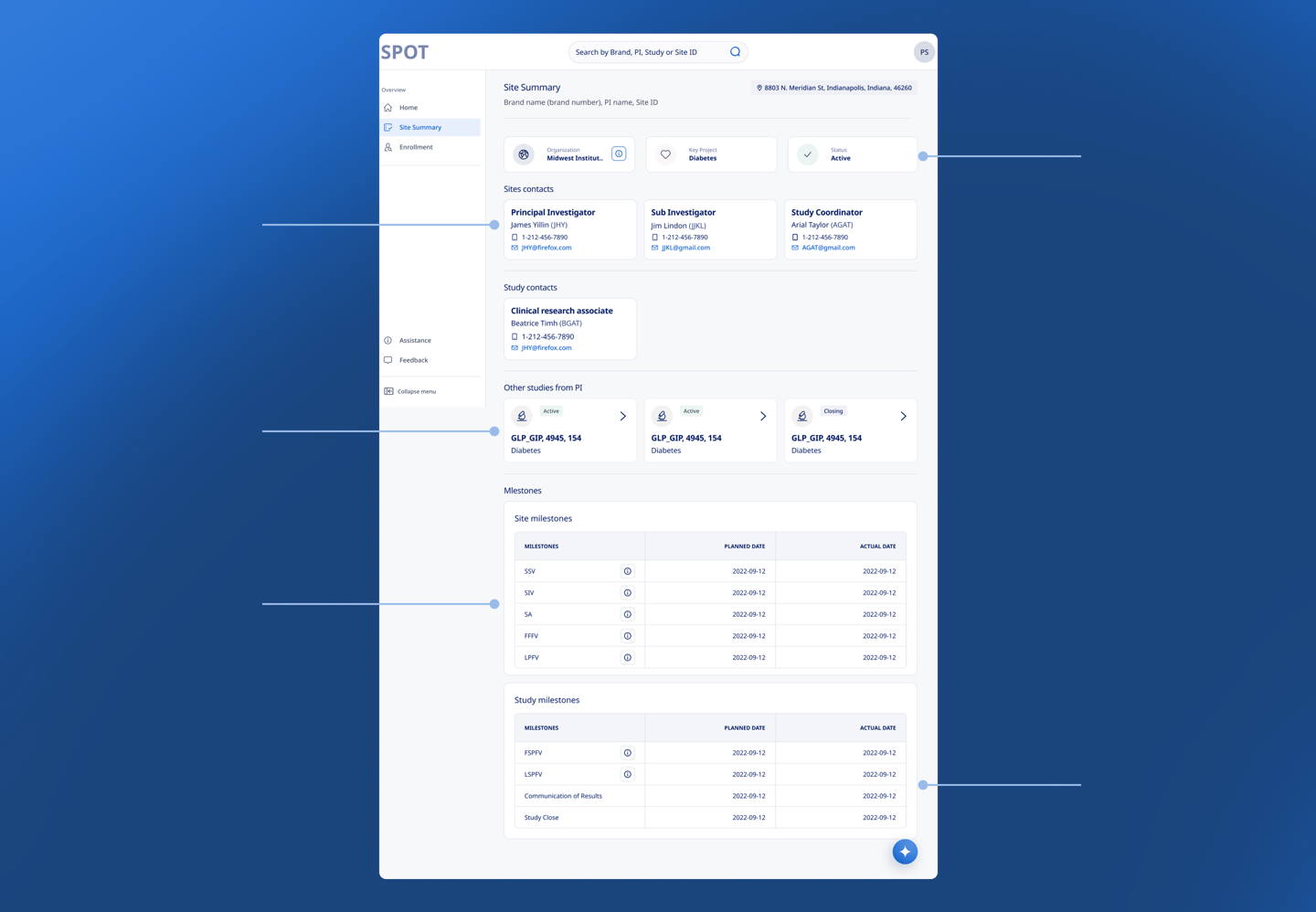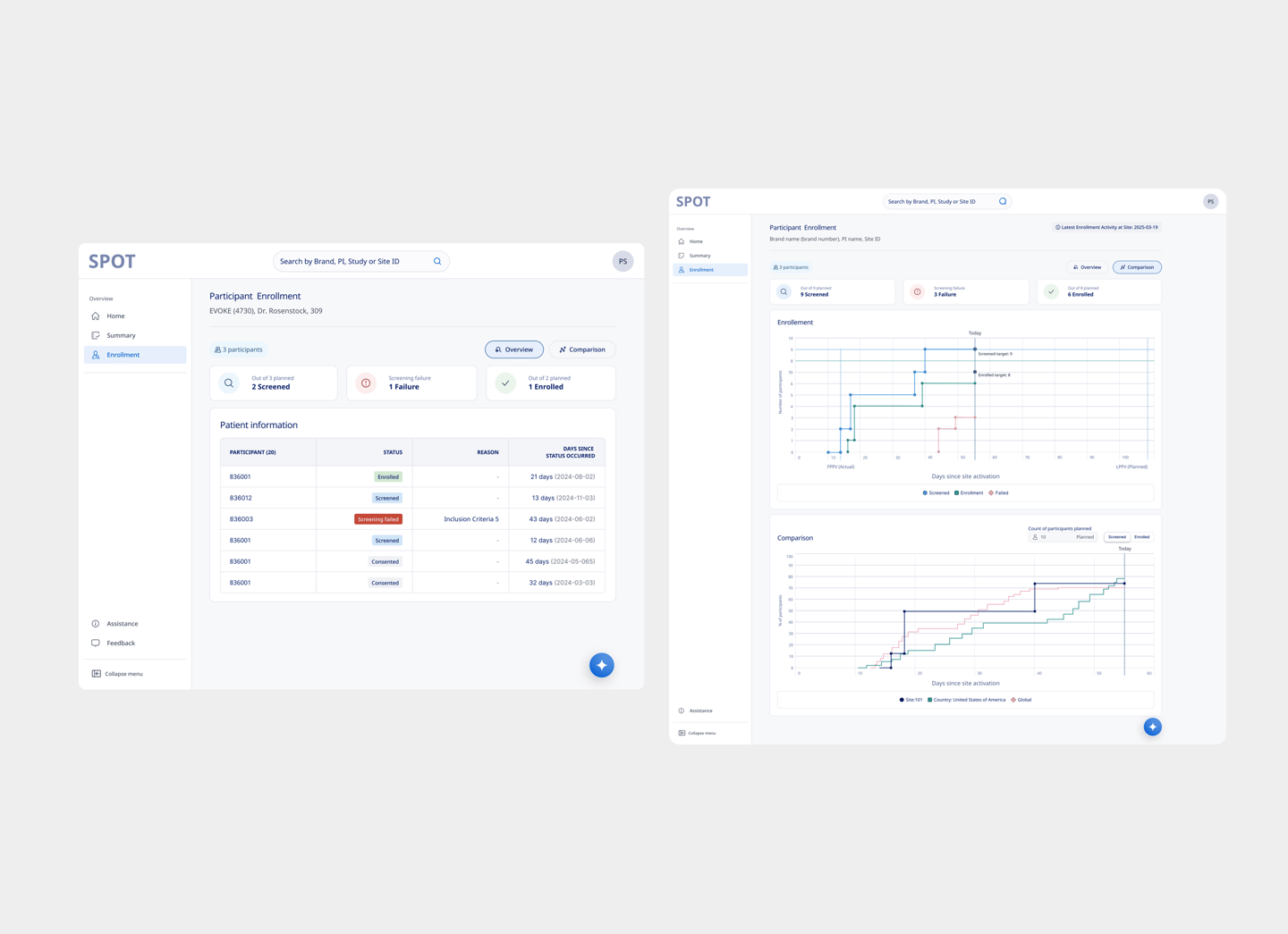 SPOT provides MLs with real-time enrollment trends and national benchmarks to drive targeted site support and investigator engagement. By surfacing participant health metrics and screening failure insights, it helps identify performance outliers and specific site needs. This streamlined access to actionable data enhances care coordination and fosters more effective interactions with healthcare providers.